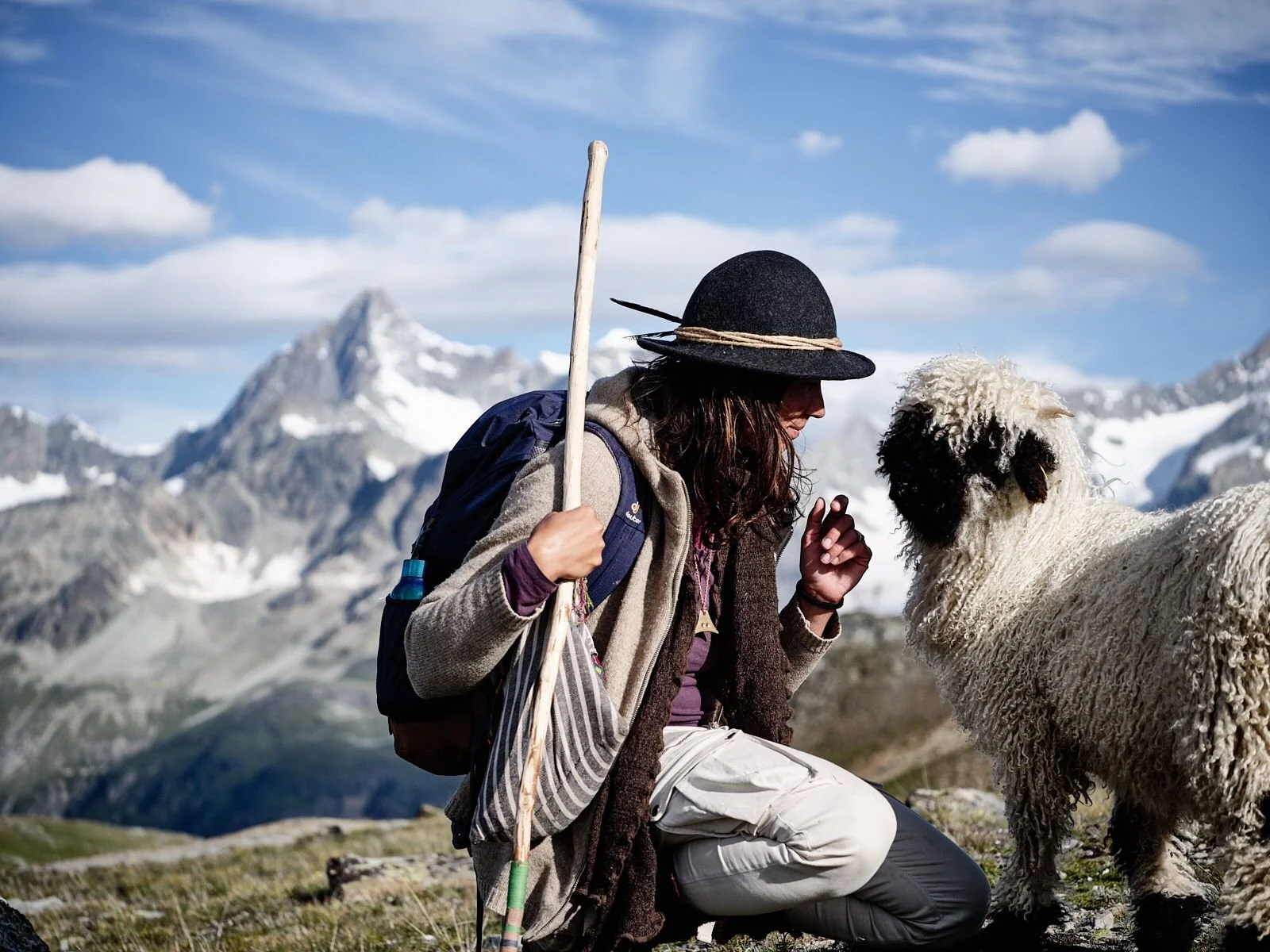 „Ich gehe über die Wiesen und Steinfelder, bei jedem Wetter. Beobachte meine Schafe aus der Ferne und von nah, tauche meine Hände in ihre weiche Wolle. An kalten Tagen kuschle ich mich zu ihnen und döse gewärmt durch die Mittagsruhe, bevor wir wieder stundenlang über die Alm steigen. Meine Intuition ist stets wach, wittert die Luft, den Wind, beobachtet die Wolken und das Licht, liest die Zeit am Sonnenstand, nimmt die Stimmung der Herde auf. Wir sind eins, tief verbunden mit der alpinen Natur. Meine Kunst beschreibt diese Verbindung für dich – ein stilles Band mit den Elementen, tiefe Wurzeln, hörst du den Herzschlag der Alpen?“
