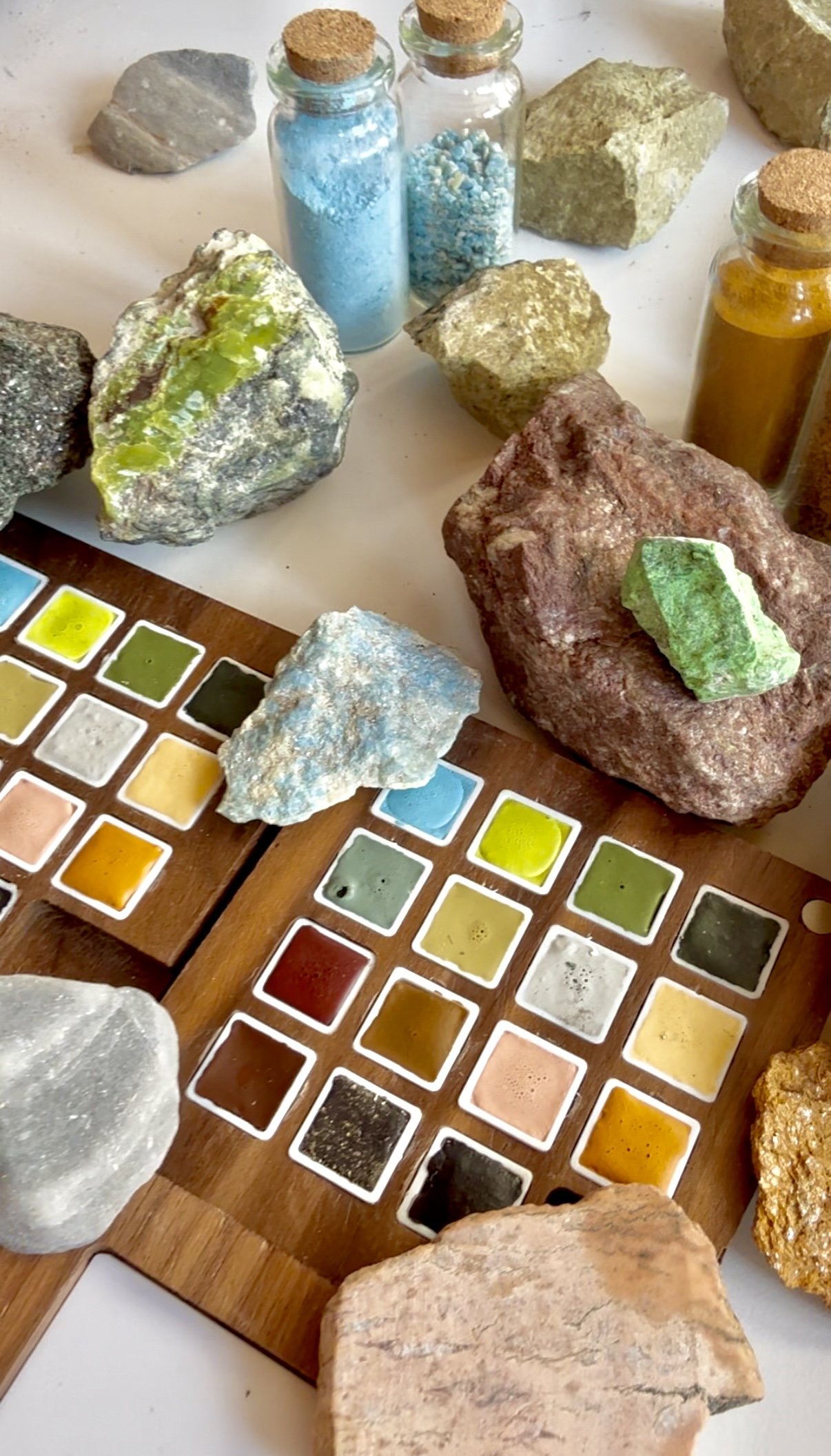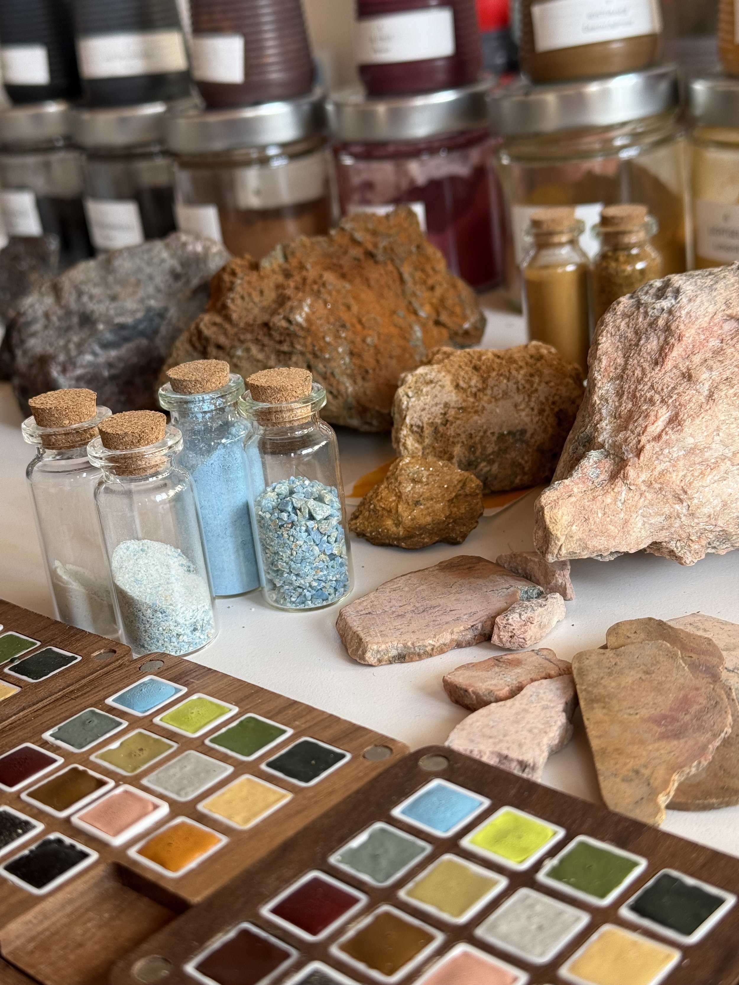 Farben aus Pigmenten, nachgemischt nach den wichtigsten, schönsten und bedeutsamsten Gesteinen und Edelsteinen aus dem Matterhorn-Gebiet, hergestellt von Hand mit Gummi Arabicum und Honig im Atelier der Künstlerin.