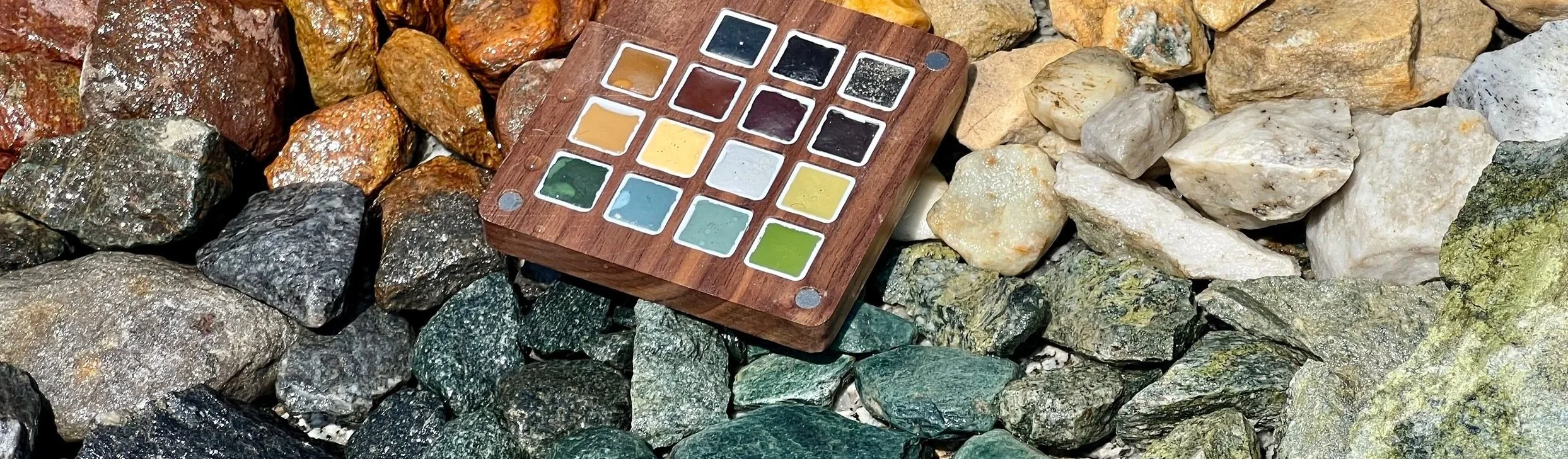 Aquarellfarben nach dem authentischen Farbspektrum der Matterhorngesteine aus Minteralpigmenten nachgemischt.