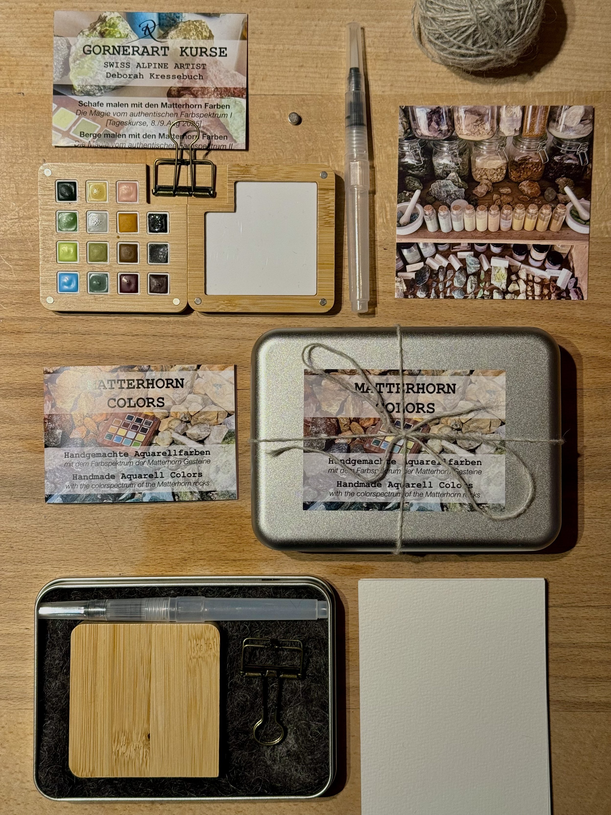 Die Künstlerin präsentatiert ihre selbstgemachten Matterhornfarben im Detail: Der Inhalt der Aquarellbox und wie sie anzuwenden ist.
